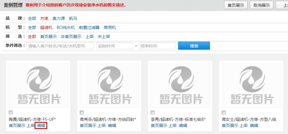 第一步:在门户管理的“案例管理”页面,打开如下图页面,针对线上销售的净水机,可选择相应品牌和型号进入编辑页面: