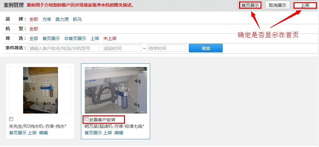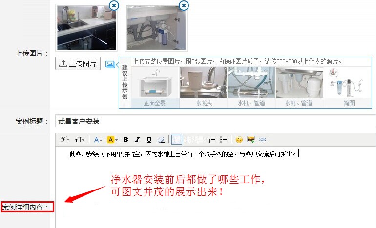 案例管理:是将您日常安装服务记录(现场拍照)展现给潜在用户阅览,因此建议使用门店的用户在给客户安装净水机时准备效果较好,像素较高的照相器材对现场安装前后拍照,经过客户允许条件下,上传到这里,以供潜在用户参观借鉴,同时也可激发客户潜在的购买欲望!