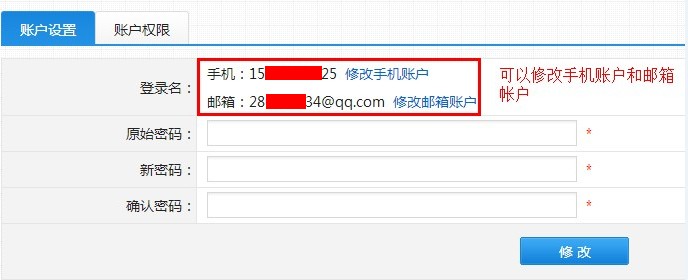 第一步:登录系统后依次进入“系统管理”——“系统设置”——“账户管理”功能页面,如下图,您可以进行手机账户和邮箱账户或密码的修改;