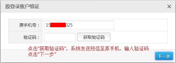 第三步:点击手机登录账号的“更改”按钮,弹出如下图手机账号修改页面;点击“获取验证码”按钮,系统会自动发送验证码至原号码手机上,输入验证码,点击“下一步”。