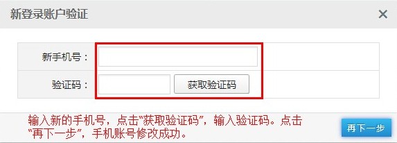 第四步:系统自动跳转到如下图页面,提示您需要输入新的手机号,然后再点击“获取验证码”按钮,系统会自动发送验证码至新号码手机中,输入验证码,点击“再下一步”则手机账号修改成功。
