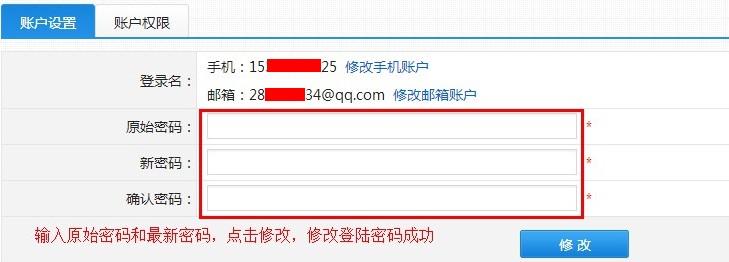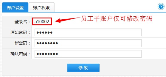 二、修改登陆密码:点击进入系统管理——系统设置——账户管理,直接进入登陆“账户设置”页面;在“原始密码”文本框中输入正确的原登陆密码后,再“新密码”文本输入框中输入新密码,再次输入“确认密码”,点击“修改”按钮则登录密码修改成功。