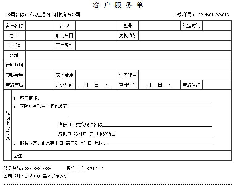 上图中被加粗字体的信息保存后将会自动引用到《派工服务单》上,如下图多联派工单样式中的:公司名称、服务热线、投诉电话和公司地址信息都是上图页面中的内容。如何科学规范派工服务?请查看“派工流程管理”帮助文章。