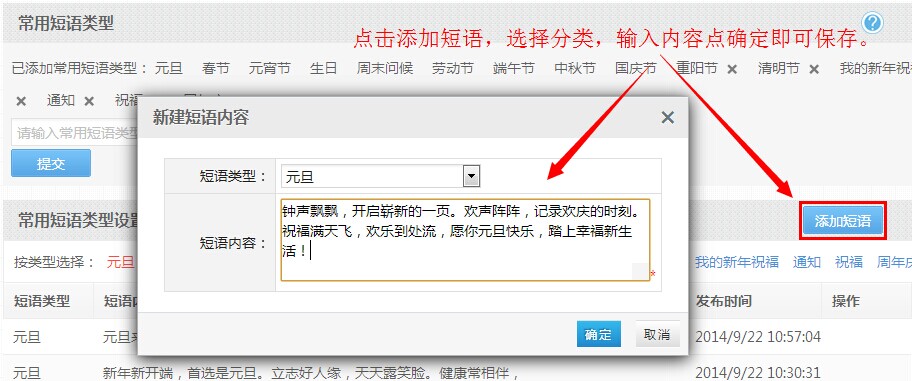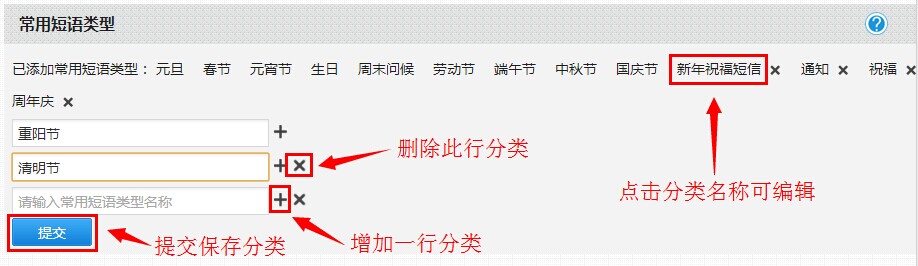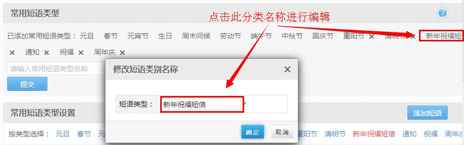 第一步:短语分类管理——系统默认“短语分类”不可以进行编辑,“短语名称”右边有个“删除”按钮的属于用户自己添加的分类,用户可随意编辑。