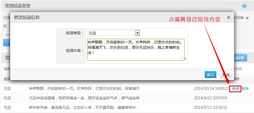 系统默认将最近添加的短信排在前列,点“编辑”按钮可对刚添加的短信内容进行修改:
