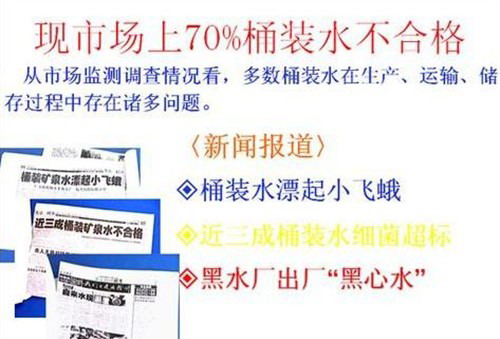 国家食品药品监督管理总局公布的专项监督抽检结果显示,瓶(桶)装饮用水抽检不合格率为23。83%。不到一个月的时间内,关于饮用水安全问题的抽样调查结果都令人担忧,在水污染不断加剧、瓶装水、桶装水、自来水问题不断的趋势下,使用家用净水器是最明智的选择。