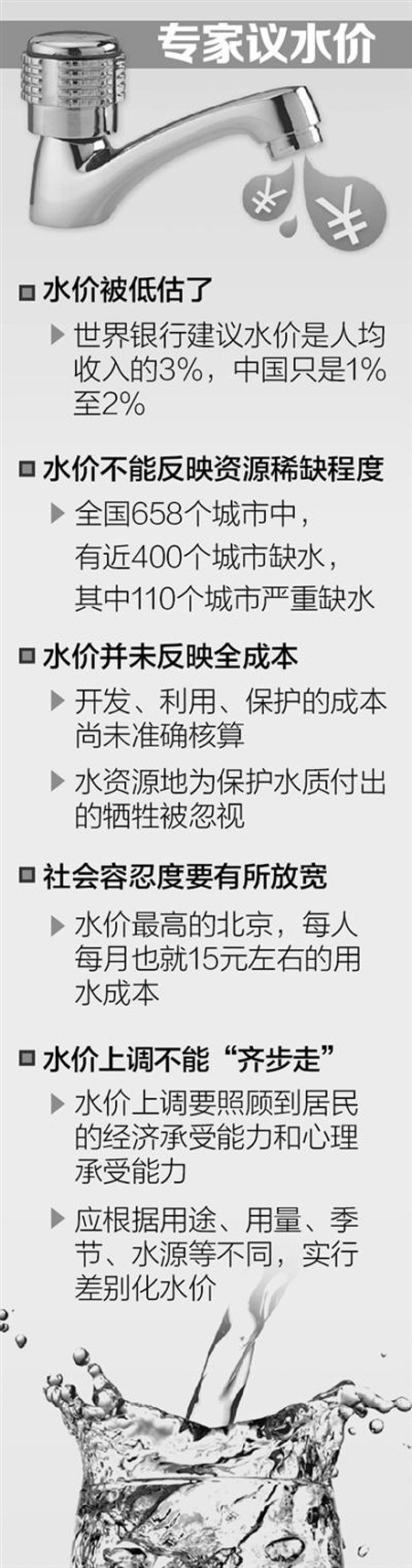 国务院发展研究中心资源与政策研究中心副主任谷树忠:我认为水价被低估了。我国是全球13个人均水资源最贫乏的国家之一,全国658个城市中有近400个城市缺水,其中110个城市严重缺水,但目前的水价不能反映当前我国水资源的稀缺程度与短缺程度。